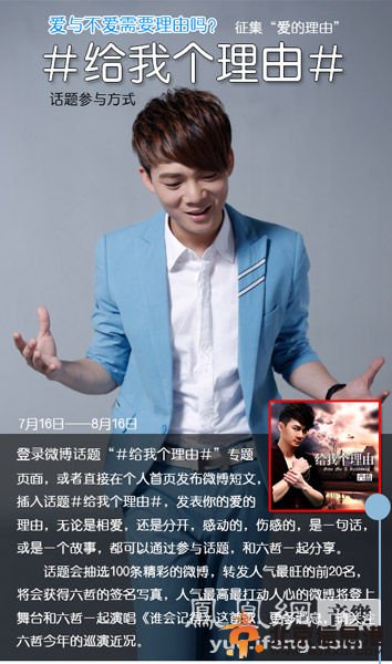 六哲与歌迷互动 华语歌坛“人气王”六哲近期举办全国百场巡演,随后将相继推出全新单曲的音乐作品和个人专辑。目前还通过微博和歌迷互动,为新歌《给我个理由》话题征集“爱的100个理由”备受瞩目。 现场之王再度回归 百场巡演火热开唱 时隔一年再度开唱,六哲带着最新歌曲的首次演绎将令大家对这次演唱会期待十足,接连曝光的《谁会记得》和《给我个理由》两首新歌,打破以往的模式,转型意味十足,动人的旋律和优美的唱腔,已让大家预先感受到这场精彩绝伦的视听盛宴。被媒体评为“现场人气王”再次回归乐坛演唱会签约不断,据主办方介绍,目前六哲各地的巡演和歌友会销售火爆,每日咨询电话不断,演唱会门票在短时间内全部售罄。人气急剧上升的六哲,对自己巡演充满期待,努力制作新专辑的他,也开始尝试新的曲风转型,他希望能给歌迷们一个惊喜,在自己的演唱上能够有更多的不一样的表现。 为爱征集“爱的理由” 与粉丝倾情互动 在此次全国百场巡演的旅程中,六哲将会向全国歌迷征集“爱的理由”,来感受每个人因为爱留下的理由,并通过话题分享最精彩的100条微博。除了用签名来回馈歌迷,还由粉丝评选出最幸运的观众将登上舞台和六哲一起演唱《给我个理由》。