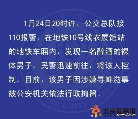 北京地铁十号线由于一组裸男睡照而引发网友围观。该组照片尺度非常大,图中的裸睡男子被疑因醉酒而“乱来”。微博网友@Happy张江转发此微博并提醒各位过年期间尽量少喝点,“醉酒伤身体不说,干粗一些蠢事醒了之后多丢人。”