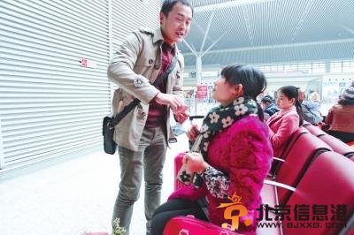 在郑州候车时,冯莹和丈夫杨海斌一刻也不愿分开。到哪冯莹都会拉着海斌的手。而海斌也会不停地搂着冯莹,两人紧紧依偎着。