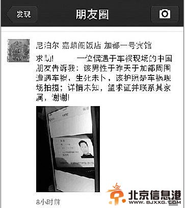 昨天上午10时许,一位名叫“尼泊尔 嘉麟阁饭店 加都一号宾馆”的网友发消息称:“求助! 一位偶遇于车祸现场的中国朋友告诉我:该男性于昨天(4月8日),在加都遭遇车祸、生死未卜。该护照(即身份证)是车祸现场拍摄,详情未知,望求证并联系其家属,谢谢!”该消息很快在微信、微博间被大量转发。冯众登记的住址是西城区地安门西大街199号。