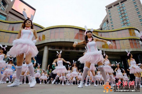4月19日,北京某商场举行复活节促销宣传活动,一群性感的“兔女郎”在街头进行“快闪”表演。中新社发 侯宇 摄