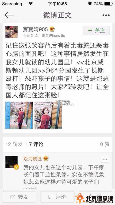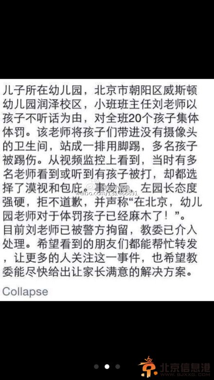 阅读完标题为(北京威斯顿幼儿园女老师长期殴打多名儿童 殴打儿童的老师照片资料)的文章后,{www.bjxxg.cn}小编为大家推荐更多相关文章,千万不要错过哦! (责任编辑:北京信息港)  |