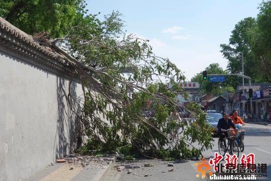 5月4日,北京东城区路边一颗大树被风吹倒,横在路中。据北京市预警中心消息:北京市气象台5月4日8时25分继续发布大风蓝色预警信号。中新社发 杜洋 摄