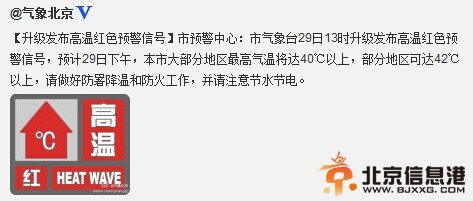 中新网5月29日电 据中央气象台消息,北京市今日发布高温红色预警。预计29日下午,北京市大部分地区最高气温将达40℃以上,部分地区可达42℃以上,请做好防暑降温和防火工作,并请注意节水节电。 防御指南: 1.有关部门和单位按照职责采取防暑降温应急措施; 2.停止户外露天作业(除特殊行业外); 3.对老、弱、病、幼人群采取保护措施; 4.有关部门和单位要特别注意防火。 阅读完标题为(北京市发布高温红色预警 部分地区可达42℃以上)的文章后,{www.bjxxg.cn}小编为大家推荐更多相关文章,千万不要错过哦! (责任编辑:北京纪事) |