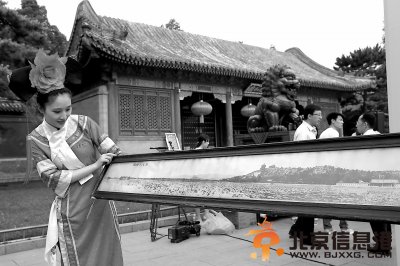 昨天,身着宫装的工作人员在展示老的颐和园全景照片。本报特约摄影 李瑞林