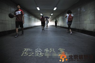 马甸桥地下通道,地面上写有“取公积金”的小广告。