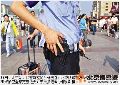 北京铁路警方透露,北京四大火车站派出所已全部更新枪支。昨日,北京火车站站前广场,派出所民警、特警、武警等均配枪执勤。各大车站如遇突发状况可进行联合处突。 据了解,此次北京铁警更新枪支,率先考虑四大火车站派出所,并对警长以上持枪民警进行了枪支业务培训。 目前,北京四大火车站广场上,车站派出所的每个岗位均配一名民警带两名辅警开展工作。除此之外,武装特警和携犬驯导员也随时守候火车站,如遇突发情况,将联合开展处突任务。 今年年初,警方在全市重点部位、繁华区域全面加强巡逻防控力度。执勤警组配备了长短枪支、防暴警棍、警用电台等处置装备开展携犬巡逻,确保发生突发事件在第一时间有效处置。 ■ 探访 民警配枪换成左轮手枪 昨日下午,北京站站前广场上,地铁站入口、进入车站的天桥口附近均有民警配枪执勤,广场上的警伞下,一名配枪民警站在警戒线外巡视,手持警用钢叉的辅警则面对车站出口执勤。记者观察发现,民警腰部的枪支为左轮手枪。据了解,此前派出所民警配备的枪支多为54式或64式手枪。 除了派出所民警外,站前广场东侧有手持步枪的特警,广场前持枪的武警也同样引人注目。 一名男乘客表示,看见这么多警察把守车站,虽然有点令人紧张,但也十分理解,“这样荷枪实弹的阵势,也是为了保护乘客的安全。”(记者刘珍妮 通讯员王海蛟)