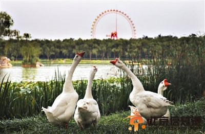 昨日,龙潭西湖西岸,一群大白鹅在湖边“曲项向天歌”,远处,北京游乐园的摩天轮俨然是这附近的地标。 新京报记者 尹亚飞 摄