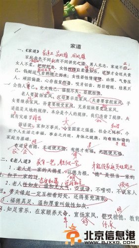 仇庄村全村“家道”仍在修改中 仇庄村,通州最南的一个村庄,相传建于明朝,由一位姓仇的人家建村。昨日下午,雨后的仇庄村主路上人烟稀少,道路两旁的墙上挂着多块“中华传统美德篇”宣传牌,另有一面墙上写着“爱妻爱子爱家庭,无视交规等于零”。 大道两旁住着仇庄村229户、16个姓氏人家,最近村民们有些忙,忙着追寻“家训”、制订“家规”。不久的将来,村里统一的“家道”也将一并出炉。按照仇庄村党支部书记王书信的设想,这些家训将由这一代村民开始代代相传,不仅“家道”必须裱在各家各户的墙上,过年时各家春联也将写上家训。 目前10户“试点”订家规 未来推及全村229户 在王书信的办公桌上,十几张A4纸上打印着“苏家”、“王家”、“高家”、“仇家”、“刘家”等十户人家的家规。王书信介绍说,这是他们从4月开始推行的一个重大活动,让每家每户根据自家的家风特色,定出家训和家规,并由现在开始作为“立家之宝”代代相传。“家训”,也将作为仇庄村管理村民、改善村风的一个手段,这一活动将持续推行3年,直至大范围建立起家规,并起到效果。 从已拟好家训的十户人家来看,家训内容不外乎是“孝悌”、“忠厚”、“勤俭”、“踏实”等基本内容,不少人家的家训雷同。王书记家也早早地拟好了家训,家训是四个词,“恕”、“正心”、“诚”、“善”;具体家规是:“学而不厌,积学储宝;诲人不倦,善行天下;诗礼传家,文质彬彬……”王书记说,他们家的家规是他和另外两个哥哥商量好的,立完家规,他立马给儿子传了一个短信,告知他今后这就是王家的家规。 仇庄村目前约有229户的人家,第一批被要求立家规的是10户家风良好的优质家庭。据村干部介绍,这10户人家算是“试点”家庭,也是他们的“顶层设计”,等这些家庭立家规探讨成熟后,将由60个村代表负责起全村200余户的“家规”建设,一个代表负责4户人家。 家规怎么定?仇庄村要求每户村民说出自己家族发生过的故事,根据家风特色拟定最适合自家的一套内容,包括“家风”、“家训”和“家规”。除了自拟之外,村委会也会帮大家把把关,还邀请了中华儒学会理事徐继福担任顾问。北京青年报记者了解到一户立家规的例子:“有个弟弟,他帮哥哥娶了六次老婆,他哥哥的第一个老婆去世了,后面几个老婆又相继跑了,但是这个弟弟一直努力帮他哥哥找老婆,还花了不少钱。这家的家训商量后就定作‘兄友弟恭’。” 立家规为更好管理村民 违背家风或将全村通报 2011年仇庄村被评为“全国文明村镇”。据村民们反映,十几年前,这个村比较乱,换了书记之后,村里十多年来一直主打“孝文化”,每年的腊月还办了一个村里最具特色的“老人节”,走访每户老人送关怀。 王书信说,虽然仇庄村已经成为一个文明村,但矛盾也不少,有时他一天要去三家调解内部矛盾,赡养问题、各家说三道四的问题等等。一旦矛盾闹大了,村民往往就去村委会反映,请求书记帮他们调解。“社会上出现的许多问题往往都源于家教,所以传统的家风很重要,几代人若一直传承下去就会产生很大的作用。” 仇庄村的几位村干部都十分坚信家训、家规未来可以起到很好的“民事调解”作用。顾问徐继福正和他们共同修订最终版的全村“家道”,这一份家道包含孝道、老人道等全方面的内容。书记说等制订完毕后要精美制作,发到每户家里,裱在墙上。至于每家每户自己的一纸家规,目前的设计是用毛笔写在宣纸上,写成两份,一份由自家珍藏以便代代相传,另一份将由村史馆保留。每逢过节时,各家要把家训写在春联上。 各家家规如何制约村民们的行为?王书信说,这是他们正在探讨的重点,也是一大难点,即如何让家规最大地发挥作用,不让它变成一纸空文。“我想的是多做、多评、多挂牌、多受益。”他说,虽然还没完全确定方案,各家的家训也还差“具体惩戒”这一部分内容,但他们的最大目的是让好家风带动差家风。他说,用农村土话说是“照顾‘好人’,经营‘小人’”。他们将定期做评比,如评出“礼仪人家”、“书香人家”、“善良人家”等等,若哪家问题大、口碑差,还将在全村进行广播通报批评,“就和酒店评星级一样,各家各户以后也会被评星级”。 村民对家规看法不一 有支持也有质疑 对于村里立家规一事,仇庄村各家各户的看法并不一致,已经交完“答卷”的十个人家大力支持家风活动,他们中有些是村干部,有些是村中拥有极好口碑的人家。村民杜振国在村中以孝闻名,他也十分看好这次的家规行动。他说他们家以孝为先,他想把自己的孝行立成家规,传给自己的女儿,再代代子孙相传。 也有部分村民对于这样的活动表示“不太感冒”。一位2岁孩子的妈妈表示,虽然知道村里正在组织大家定家规,但她并不关心,有没有家规都可以。王书信也承认,肯定有部分村民的参与热情是比较低的,尤其是文化程度较低的家底,支持性比较小,但他相信一旦有人带动,家规的影响面就会越来越广。 对于仇庄村的“家规治村”,北青报记者随机采访了一些村民,有些村民认为自有管好家事的方式,并不需要家规这样的东西,也有一些存在较大矛盾的家庭,对于这种家规活动处于无视状态。 对话 “家风好了才能改变村风” 对话人:仇庄村党支部书记王书信 北青报:为什么想让每户村民立家规? 王书信:一档 “新