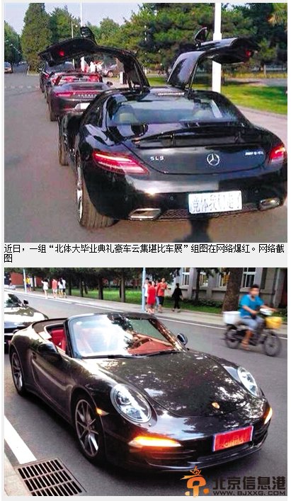 保时捷、法拉利、劳斯莱斯……日前,一组题为“北体大毕业典礼豪车云集堪比车展”的组图在网络爆红。 昨日,该校相关负责人称,车队并非用于毕业典礼,而是学生拍摄毕业短片时租来的“道具”。 校友感叹“卧虎藏龙” 在网络热传的图片中,可以看到法拉利、保时捷、劳斯莱斯等顶级车辆,车牌则都被遮盖,上写“竞体我们走了”,“鲍老师再见”等。 图片被加上了北京体育大学、豪车、毕业典礼等标签,被众多网友热评。截至昨日22时,微博上相关话题已有数千人参加、评论。有学生表示早知道北体大竞技体育学院“卧虎藏龙”,没想到真的高调起来了,也有网友质疑“毕业不应如此高调”。 “在综合楼附近停了一会儿。”昨天下午,一名学生回忆当时的情景时说,听说开车的都是竞技体育学院的学生,他们“家境都不错”。 学生经劝说驾车离开 北体大相关负责人表示,网传消息不实,车队并非参加毕业典礼所用。“我们的毕业典礼在6月25日”,但车队在20日就出现在校园中。 “学生想搞个标新立异的活动。”该负责人称,由于一名竞技体育学院的学生认识租赁公司的工作人员,便想租几辆豪车进学校,“听说打算拍个短片,是学生自发进行的”。 该负责人称,学校老师看到后,对学生说这么做不合适,学生随后就把车开走了。 学校一老师称,学生此举是希望表达对母校和老师的留恋之情,他们“比较单纯,肯定想不到会引起这么大的影响”。(记者黄颖) 阅读完标题为(北体大“豪车云集”系学生租车拍片)的文章后,{www.bjxxg.cn}小编为大家推荐更多相关文章,千万不要错过哦! (责任编辑:北京纪事) |