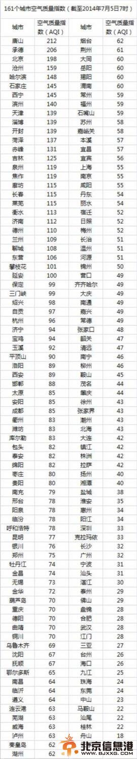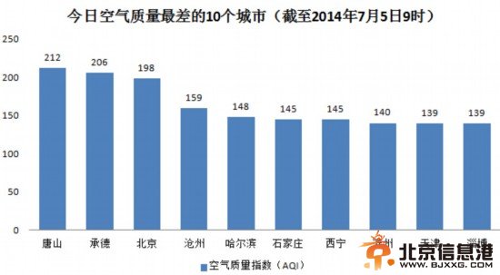 ![]() 人民网北京7月5日电 (杨翼)根据环保部公布的最新数据,截至今日早上9时,唐山的AQI(空气质量指数)为212,属于重度污染,成为161个参与空气质量排名的城市中空气质量最差的城市。今日空气质量最差的10个城市分别是唐山、承德、北京、沧州、哈尔滨、石家庄、西宁、滨州、天津和淄博。 ![]() 说明:自2014年1月1日起,环保部发布空气质量实时信息、空气质量月报及参与空气质量排名的地级城市已由74个增加到161个,包含了直辖市、省会城市、计划单列市、“三区”所有地级城市、环保重点城市和环保模范城市。人民网环保频道将采用环保部的官方数据,对161个城市每日空气质量进行排行。(实习生 焦蕊) 阅读完标题为(今日空气:北京连续三天全国空气倒数(图))的文章后,{www.bjxxg.cn}小编为大家推荐更多相关文章,千万不要错过哦! (责任编辑:北京纪事) |