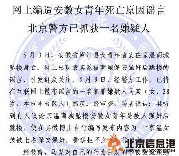 长微博 女子网上编造安徽女青年死亡原因谣言被抓获(图) 北京市公安局9日在其官方微博“平安北京”发布消息称,一名嫌疑人因在网上编造安徽女青年死亡原因谣言,已被北京警方抓获。 5月3日,安徽省庐江县女青年袁某在京温商城坠楼身亡。网上出现袁某系被商城保安强奸后跳楼的谣言,引发群众关注。 5月9日,经警方工作,已将在互联网上散布谣言的一名犯罪嫌疑人马某(女,28岁,北京市丰台区人)抓获。 北京警方称,经审查,马某供认:其听到有人议论京温商城坠楼安徽女青年是被人强奸后跳楼,便在其微博上自行编写发布内容为“京温女孩被7名保安强奸,警察拒不立案”等博文。 经教育,马某对自己的行为引发的不良效应深感痛悔。目前,警方正在进一步审查,将依法进行处理。(完) 阅读完标题为(北京女子造谣“坠亡女孩曾遭7名保安强奸”被抓)的文章后,{www.bjxxg.cn}小编为大家推荐更多相关文章,千万不要错过哦! (责任编辑:北京信息港) |