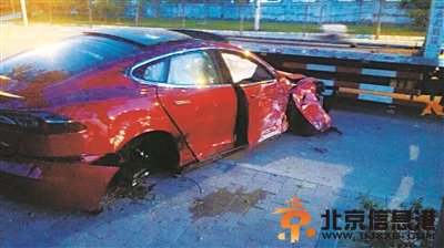 被撞特斯拉轿车的尾部 本报讯(记者 罗京运 实习记者 马骏)昨日下午4点左右,在北京朝阳区酒仙桥东路,一辆红色的特斯拉跑车发生车祸,冲出马路撞向人行道上的电灯杆,受损严重。据了解,事故中并无人员伤亡。 北青报记者到达事发现场时,撞损严重的红色特斯拉车尾已经冲上便道,车身右侧是被撞弯的电灯杆。特斯拉的右后轮已经撞飞,右前轮也已经变形,车内安全气囊弹出,车身被刮花。 据特斯拉的司机称,事故发生时,车上共有两人。特斯拉是其单位所有,他昨日和另外一位同事开车外出办事。车在自东向西行驶的过程中,与一辆正在掉头的车发生碰撞。特斯拉冲出马路后发生了后旋,汽车右侧与路边的电灯杆直接碰撞。发生碰撞后,特斯拉又再度弹出,撞向一辆停在路边的班车后停下。 “身体没出什么事。”司机表示,出车祸后,车内的气囊弹出,车内两人都没有大事,司机的同事身上有一些擦伤。据了解,发生事故的特斯拉同款车型市值约在80万元左右。 昨日晚8点左右,一辆拖车赶来试图拖走受损的特斯拉。由于车轮丢失,拖车拖动会造成特斯拉底盘受损,拖车迟迟没有行动。最终,车主决定让吊车起吊运走这辆价值不菲的特斯拉。 阅读完标题为(80万特斯拉跑车连撞两车严重受损)的文章后,{www.bjxxg.cn}小编为大家推荐更多相关文章,千万不要错过哦! (责任编辑:北京纪事) |