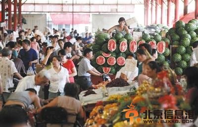 7月28日,德内大街四环市场,一位摊主守着西瓜摊。该市场将于9月30日关闭。新京报记者 薛珺 摄