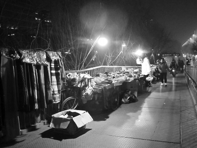 近日,本报接到读者打来电话反映,在地铁1号线传媒大学东北出口外的过街天桥附近,每天傍晚都有人在摆摊,这些商摊占据了道路,影响周边道路通行,希望城管部门能管理一下。 1月14日晚7点多,笔者来到读者反映的过街天桥了解情况。走出地铁1号线传媒大学东北口,就是一座过街天桥,步行几十米后的下坡路边,有十几个地摊摆在桥上,占据了一半的步行道,几乎每个摊位上面都挂着一盏灯,灯下的摊位上整齐码放着手套、棉帽、围巾、袜子等生活用品。其中一个摊位附近地上摆着几个大包和箱子,包里面露出了没有拆封的手套和围巾。 一位女孩走到一个摊位前,选了一顶帽子,拿起镜子照照,试了几顶后买了一顶交钱走开。不到一刻钟的时间,有两位顾客买了摊贩的东西。 在这座立交桥下西侧不远的梆子井公交车站附近,沿路的摊贩约有十余个。这些摊贩以公交车站为中心向两边摆开,大多数推着三轮车售卖各种小吃。其中有两个摊贩将小车停在路边,在人行道上架起几米长的晾衣架子,上面挂满了各种颜色的运动裤,不停地叫卖,“外贸运动裤便宜甩卖。” 笔者发现这条街的摊贩侵占了公交车站周围的道路,造成来往行人行走困难。一位学生样的女孩子说,她以前在这条路上买东西,被小偷偷了钱包,现在每天晚上都有人摆摊,太乱了,城管应该管管这里的道路秩序。通讯员 郭琼 阅读完标题为(十余个无照摊位点灯叫卖)的文章后,{www.bjxxg.cn}小编为大家推荐更多相关文章,千万不要错过哦! (责任编辑:北京纪事) |