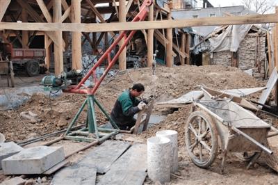 东城区北锣鼓巷与小经厂胡同之间一处四合院内,工人进入已经挖好的地下室内施工。