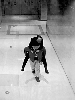 ▲监控录像显示黑衣女子被一男子背着走出商场。