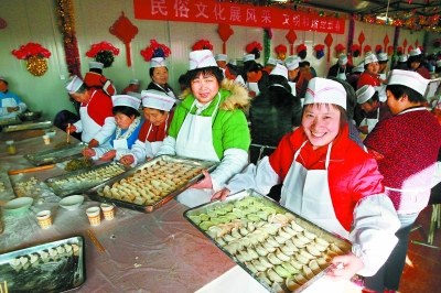 昨天,海淀区苏家坨镇农家院内张灯结彩,村民们欢聚一堂,包饺子、看演出。 本报特约摄影 李瑞林