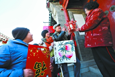 五道营商会的商户们带着福袋、红灯笼向胡同中的居民送福拜年。 本报记者 孙戉摄