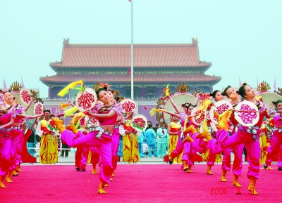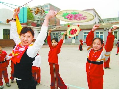 ▲新桥路中学太平鼓表演队出访悉尼前排练。 ?2005年,太平鼓传承人指导学生练习太平鼓。 ▼2006年4月9日学生们在天安门排练演出。