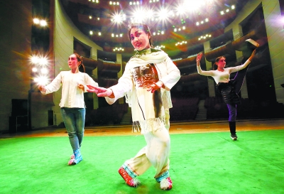 大年初二,在大兴剧院,北京市河北梆子剧团优秀演员王洪玲(中)和两名刀马旦演员张华(右)、李秀朵(左),利用演出前的时间走台,反复熟悉表演动作。本报记者 方非摄