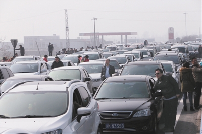 昨日,兰南高速河南段,堵在高速路上的汽车车主下车休息。 记者 秦斌 浦峰 王贵彬 实习生 彭子洋