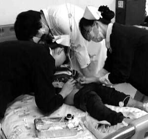 北医三院的医生和护士正在对孩子进行抢救。