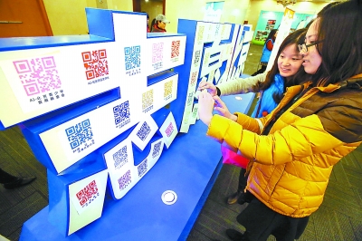 昨天,“传承的力量——2015年北京学雷锋志愿服务推动日”活动举行。志愿者正在指导通过“志愿云”手机App操作系统扫描有关“志愿团体”和“志愿项目”的二维码。 本报记者 方非摄