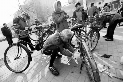 昨天是全国学雷锋纪念日,北京交通宣传教育中心联合市自行车运动协会在全市24个站点开展“义务修车学雷锋·绿色出行助畅通”公益活动,为市民修理废旧自行车,倡导绿色骑行、低碳出行的生活理念。本报记者 孙戉摄