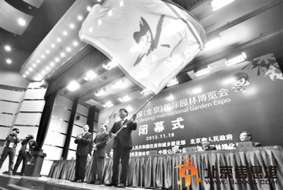 昨日,北京园博会闭幕式现场,北京,武汉两地的代表交接会旗。下一届园博会将在武汉举行。新京报记者 王嘉宁 摄