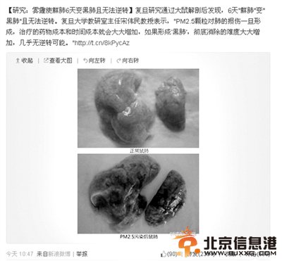 该报道称,“研究通过大鼠解剖后发现,6天鲜肺变黑肺且无法逆转。”该报道称,研究实验负责者,复旦大学公共卫生学院环境卫生教研室主任、博士生导师宋伟民说:“PM2.5颗粒对肺的损伤一旦形成,治疗的药物成本和时间成本就会大大增加,如果形成黑肺,彻底消除的难度大大增加,几乎无逆转可能。”