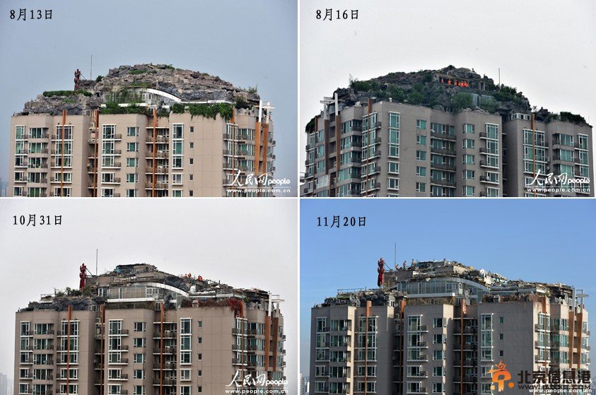 人民网北京11月20日电 (记者翁奇羽 贾玥) 截至今日,北京“最牛违建”人济山庄楼顶别墅拆除工作已进行了100天。本网记者今天上午到现场发现,与半个月前的情况相比,拆除工作并无明显进展,本月底前全部拆除完毕近乎无实现可能。人济山庄楼顶别墅位于北京西三环白石桥附近,违法建设为2605室房主张必清所建。他只购买了楼顶约100平方米跃层,却占据整个楼顶近千平方米,并在顶层加盖用花草、树木、假山堆积成的“别墅”,墙体外表还使用岩石质感外壳包裹。北京城管部门从2008年12月起多次对这处违法建设进行调查未果。今年8月15日开始正式展开对“最牛违建”的拆除工作。10月30日,北京市海淀区城管执法监察局宣教科科长戴军对中新社记者表示,拆除工作一直没有中断,但由于高空施工难度高,只能靠工人手工操作,且整栋楼只有一部货运电梯,进而进展缓慢。戴军表示,城管部门已要求工人在确保安全和不扰民的情况下加快速度。他还预计,“最牛违建”将在11月底前全部拆除完毕。