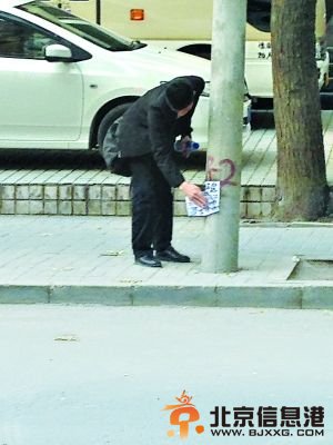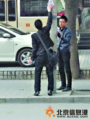 昨天下午,在丰台区安乐林路北侧的人行道上,出现一高一矮两个年轻人,每人都背着一个斜挎包,一只手拿着矿泉水瓶装的胶水,一路走一路贴,在他们身后,几乎每一根电线杆、行道树上都留下了一张白纸,上面歪歪斜斜写着“出租平房”几个字及一串电话号码。记者随即向城管举报,得到的答复是:抓不了,只能派人去清。