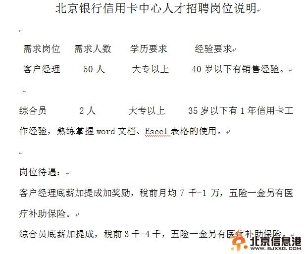![]() 客户经理 50人 大专以上 40岁以下有销售经验。 综合员 2人 大专以上 35岁以下有1年信用卡工作经验,熟练掌握word文档、Escel表格的使用。 岗位待遇: 客户经理底薪加提成加奖励,稅前月均7千-1万,五险一金另有医疗补助保险。 综合员底薪加提成,稅前3千-4千,五险一金另有医疗补助保险。 联系人:王艳秋 联系电话:13381088029 阅读完标题为(北京银行信用卡中心人才招聘岗位说明)的文章后,{www.bjxxg.cn}小编为大家推荐更多相关文章,千万不要错过哦! (责任编辑:北京信息港) |