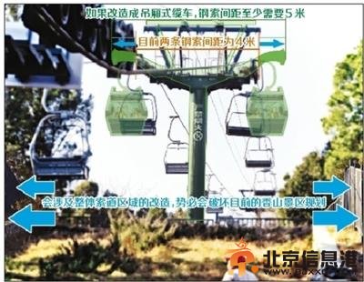 首先是机房和载客平台,目前香山索道的载客平台面积约为100平方米,机房主电动机的功率为1250千瓦。而据了解,吊厢式索道的载客平台一般在150平方米以上,提供驱动力的电机功率也大大超过1250千瓦。香山索道钢绳间距为4米,吊厢式索道的钢绳间距按规定则应达到5米。因此,要更换成吊厢式,香山索道的机房、载客平台、钢绳、塔基等须全面更换。