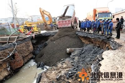 昨日,北京东四环外环方向大郊亭桥南辅路,抢险人员在封堵漏水管道后回填大坑。当日凌晨,此处一直径600毫米的自来水管道破损,造成路面塌陷,形成深约4米、面积近百平米的大坑。