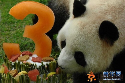资料:2011年7月26日,中央政府赠澳门大熊猫“心心”3周岁生日,“心心”在澳门过首个生日,澳门特区民政总署特意为“心心”举办生日会,送上特别制作的生日蛋糕。