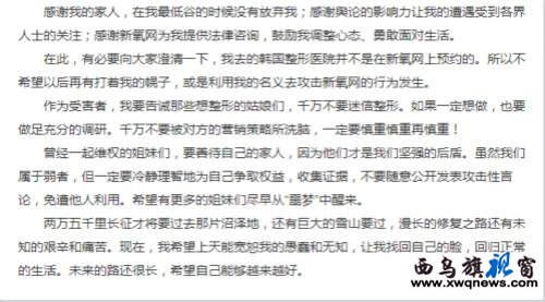 声明中,薇薇感谢新氧网给她提供法律上咨询援助,并首度澄清自己虽然是这家全国最大的美容整形信息发布与社区平台的注册用户,但其实并没有通过新氧网预约任何韩国的医院,更表示今后不希望有心之人利用她的名义恶意攻击这家互联网平台。 10月26日薇薇曾在东方卫视《东方直播间》节目上哭诉自己的惨痛遭遇,节目邀请国内权威整形医生、著名律师、媒体人雷鸣一同对当下的整形风潮做出评论,提醒众多爱美人士在做整形的过程中要提高法律意识和审美意识。